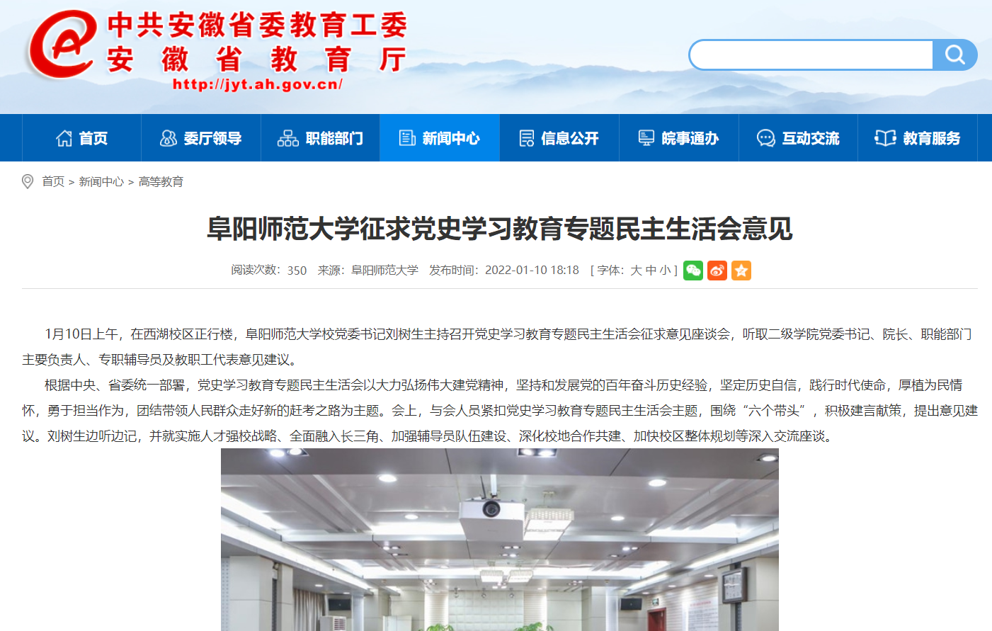 1月10日,安徽教育网报道:阜阳师范大学征求党史学习教育专题民主生活会意见。文章地址: