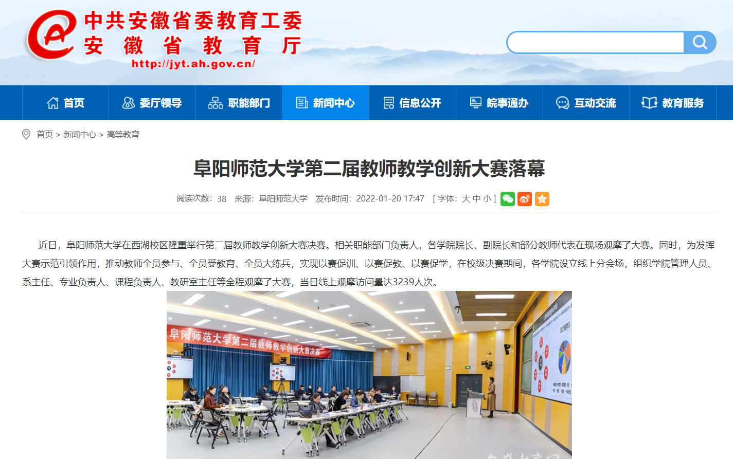1月20日,安徽教育网报道:阜阳师范大学第二届教师教学创新大赛落幕。文章地址: