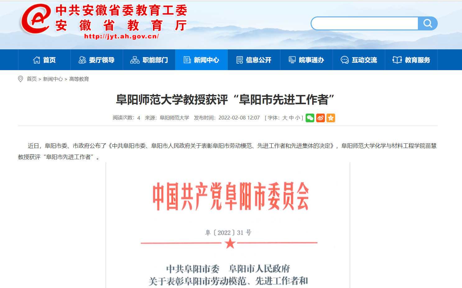安徽教育网报道:阜阳师范大学教授获评“阜阳市先进工作者”