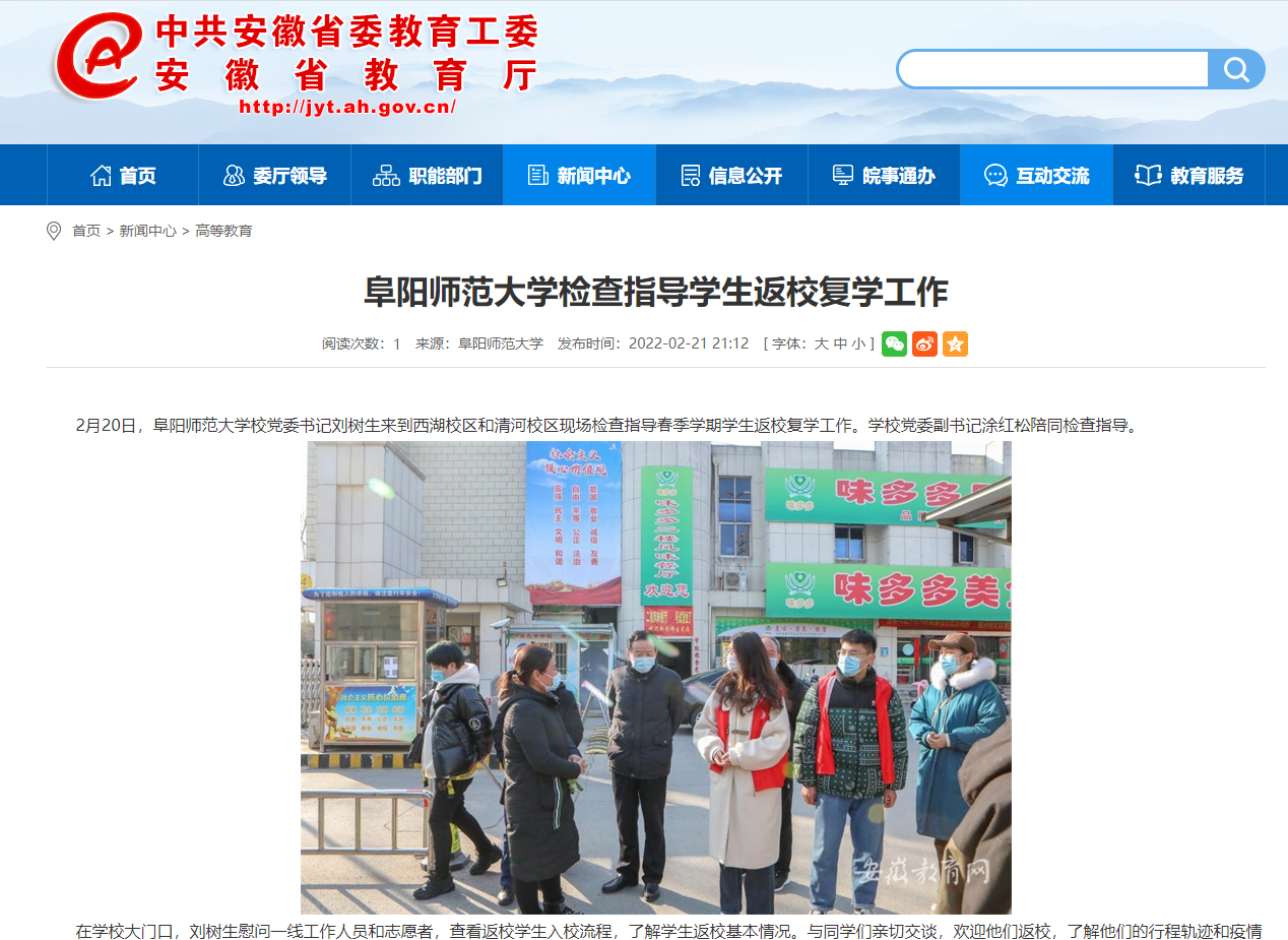 2月21日,安徽教育网报道:阜阳师范大学检查指导学生返校复学工作。文章地址: