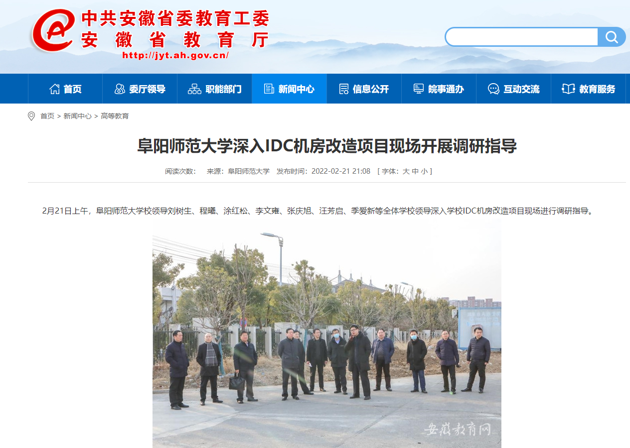 2月21日,安徽教育网报道:阜阳师范大学深入IDC机房改造项目现场开展调研指导。文章地址: