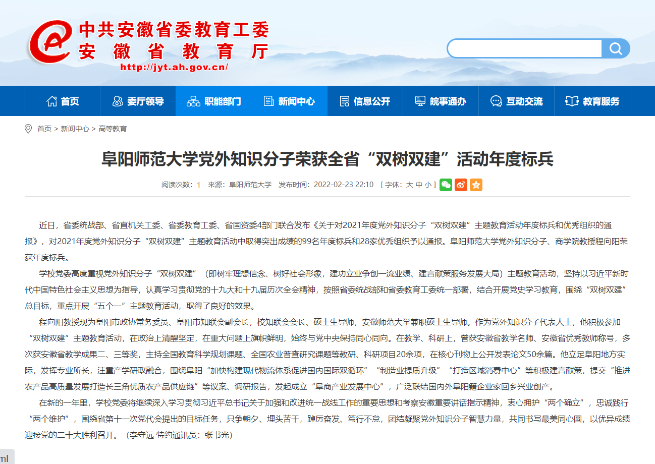 安徽教育网报道:阜阳师范大学党外知识分子荣获全省“双树双建”活动年度标兵