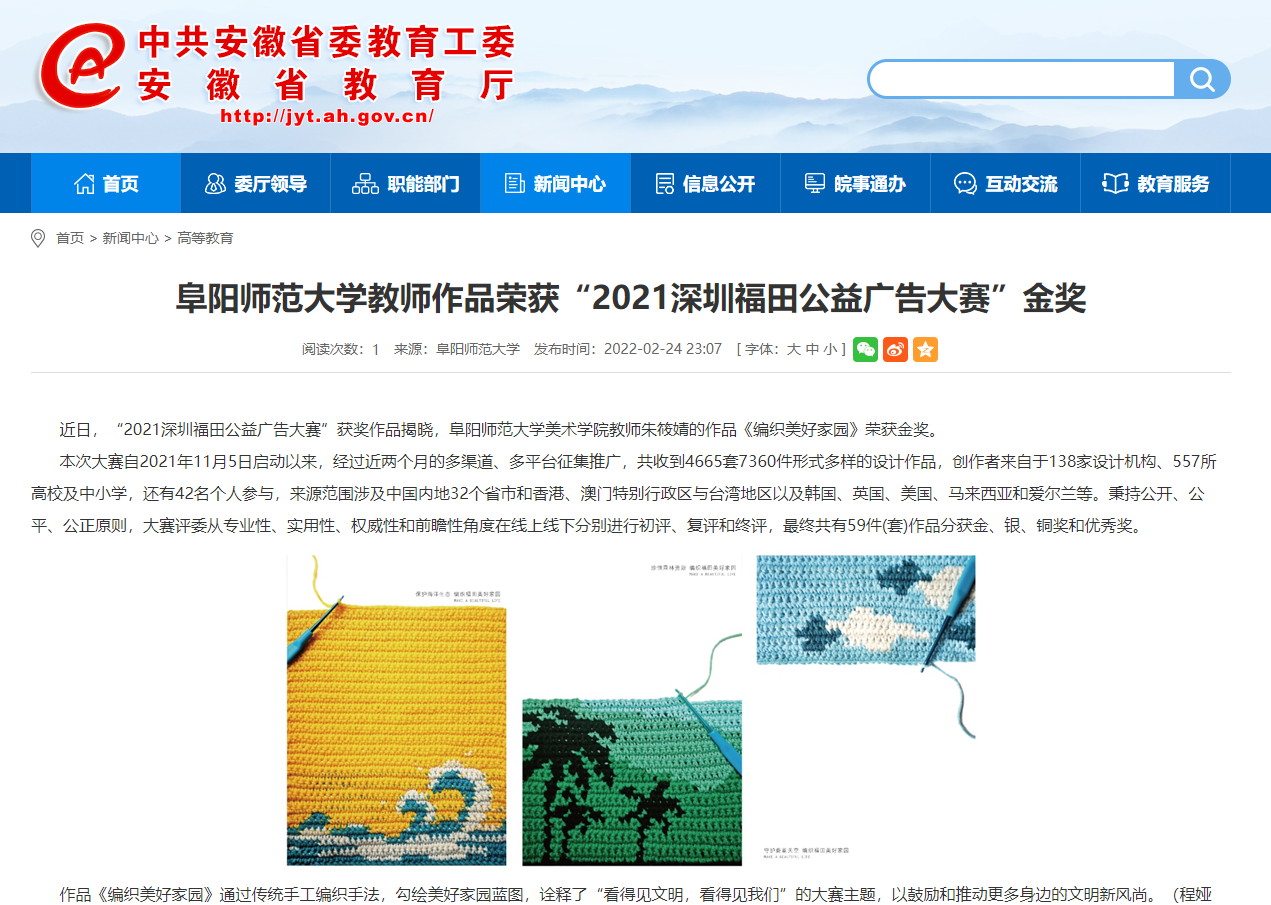 2月24日,安徽教育网报道:阜阳师范大学教师作品荣获“2021深圳福田公益广告大赛”金奖。文章地址: