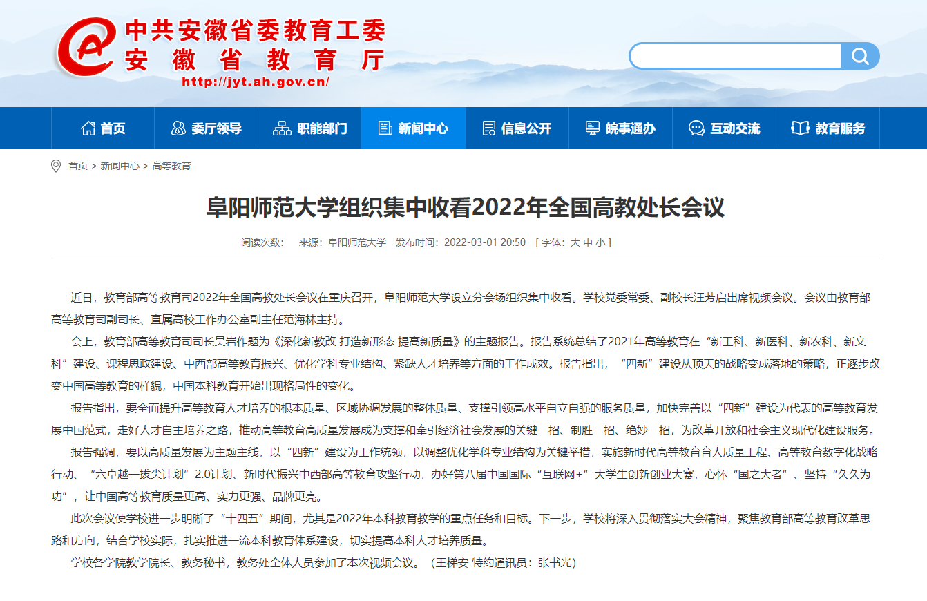 安徽教育网报道:阜阳师范大学组织集中收看2022年全国高教处长会议