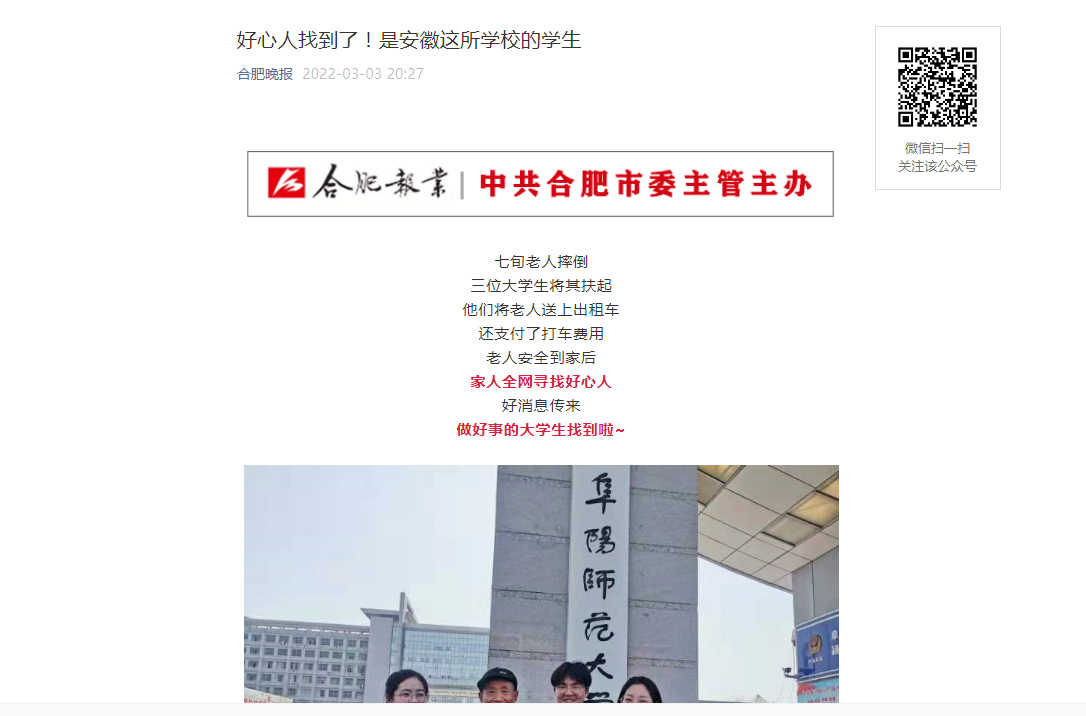 3月3日,合肥晚报微信平台报道:好心人找到了!是安徽这所学校的学生。文章地址:https://mp.weixin.qq.com/s?__biz=MzA5NTE4NDIyMw==&mid=2654490632&idx=3&sn=6b07f426541504a3343500a5d1cdddb8&chksm=8b8fc438bcf84d2e0729ba7d7ce28f16d93d8097a6132b484d08eca598bf6e92a946bc10ba1f&mpshare=1&scene=23&srcid=0304D61rjgUYzsP9CHJwxLf3&sharer_sharetime=1646358034436&sharer_shareid=b8542902f3f2de5e6064d9a4ef374629#rd