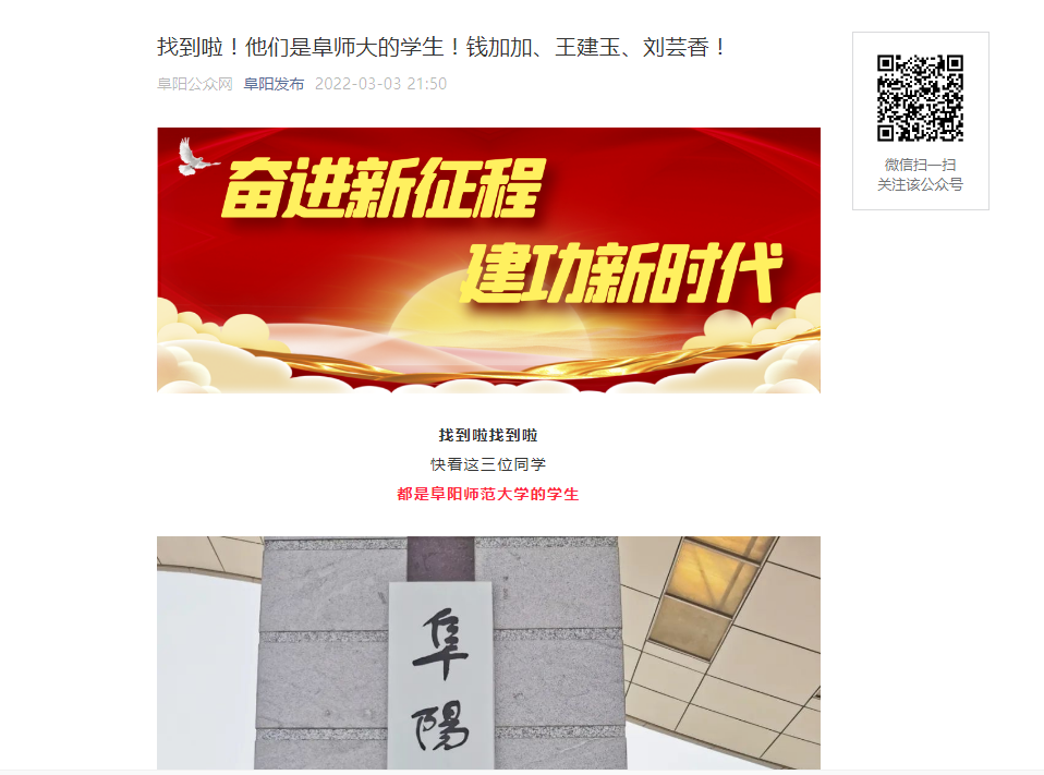 3月3日,阜阳发布微信平台报道:找到啦!他们是阜师大的学生!钱加加、王建玉、刘芸香!文章地址:https://mp.weixin.qq.com/s?__biz=MjM5OTU0NzMwMA==&mid=2651435814&idx=2&sn=effbeae8e315b7f6f371074371aa98ce&chksm=bcc4cbed8bb342fba3dcf7ce7b33e83a1f6b2dfd70cd45fc429d55e6d1859857ac2af10faf4c&mpshare=1&scene=23&srcid=0304sDGvYA72E2YPKGtmgrpp&sharer_sharetime=1646358048465&sharer_shareid=b8542902f3f2de5e6064d9a4ef374629#rd