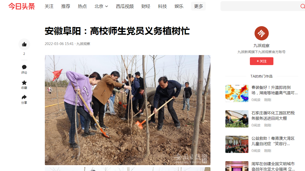 3月6日,今日头条报道:安徽阜阳:高校师生党员义务植树忙。文章地址:https://www.toutiao.com/i7071888996749541901/?tt_from=weixin&utm_campaign=client_share&wxshare_count=1×tamp=1646610936&app=news_article&utm_source=weixin&utm_medium=toutiao_ios&use_new_style=1&req_id=2022030707553601014104513403C22064&share_token=2EF0EFE5-A6B7-42FD-8F36-852B7FF4CD98&group_id=7071888996749541901&wid=1646614852011
