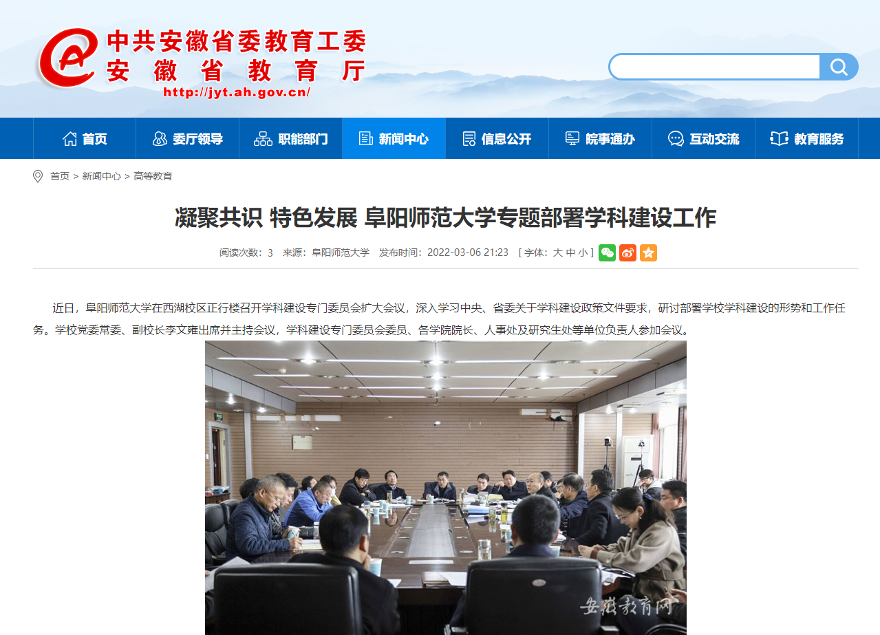 安徽教育网报道:凝聚共识 特色发展 阜阳师范大学专题部署学科建设工作