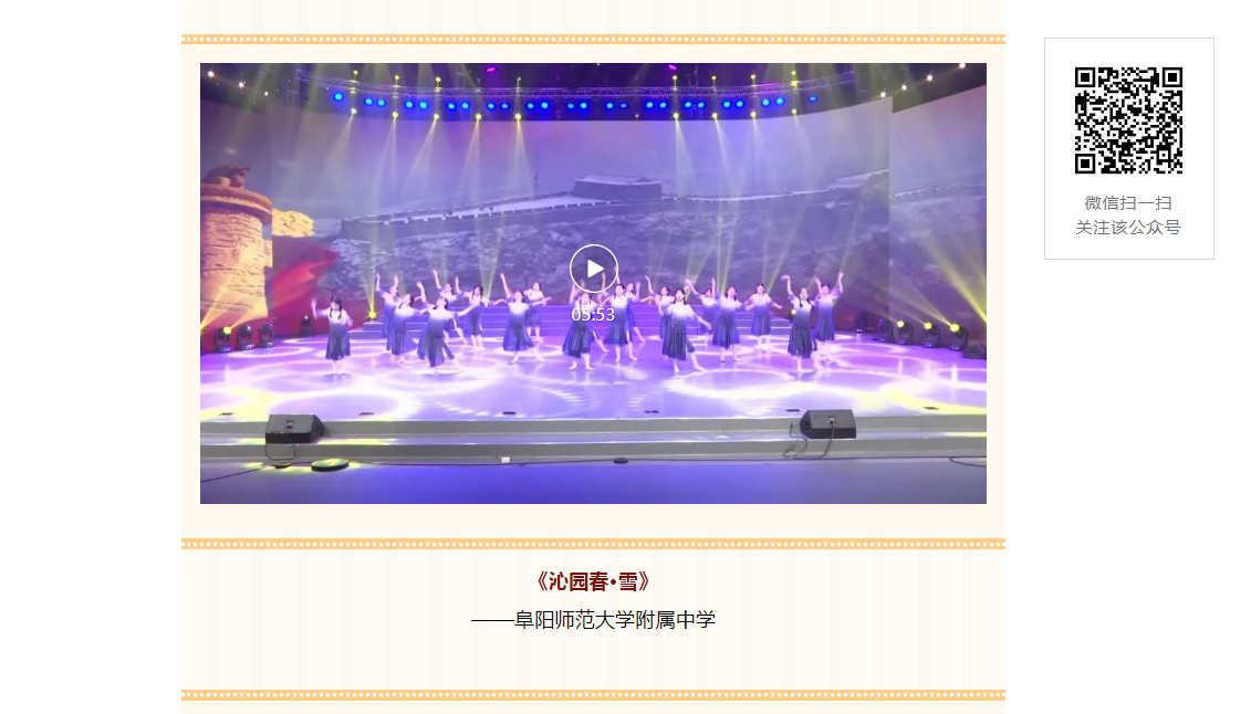 3月9日,安徽省教育厅官微报道:阜阳师范大学附属中学舞蹈作品《沁园春·雪》被选为安徽省第七届中小学生艺术展演活动优秀作品。文章地址:https://mp.weixin.qq.com/s/pg1qWWMiGDzhrFkrtRgt-g