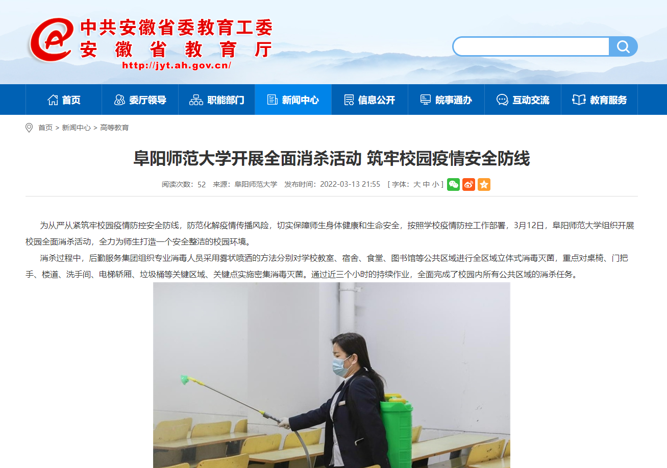 3月13日,安徽教育网报道:阜阳师范大学开展全面消杀活动 筑牢校园疫情安全防线。文章地址: