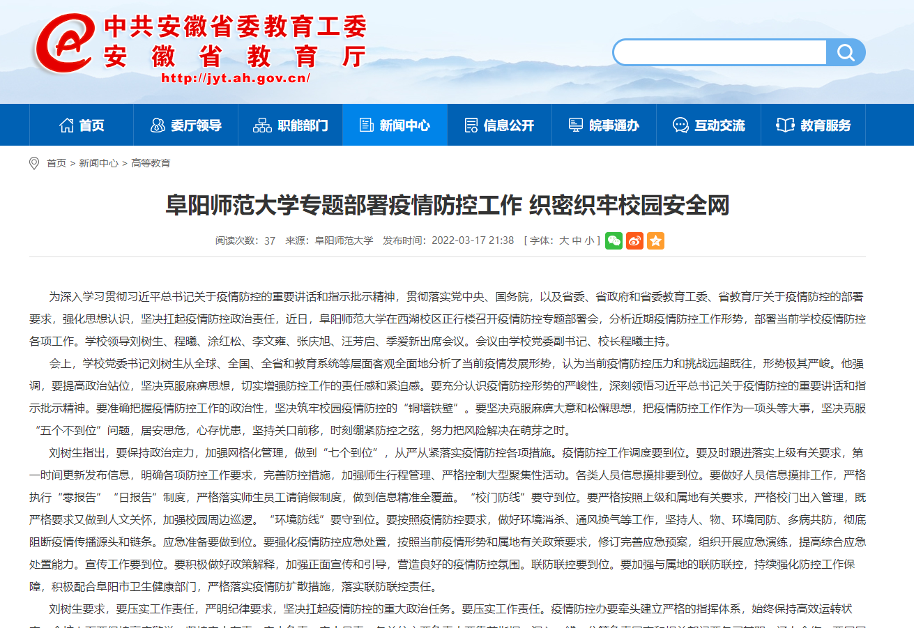3月17日,安徽教育网报道:阜阳师范大学专题部署疫情防控工作 织密织牢校园安全网。文章地址: