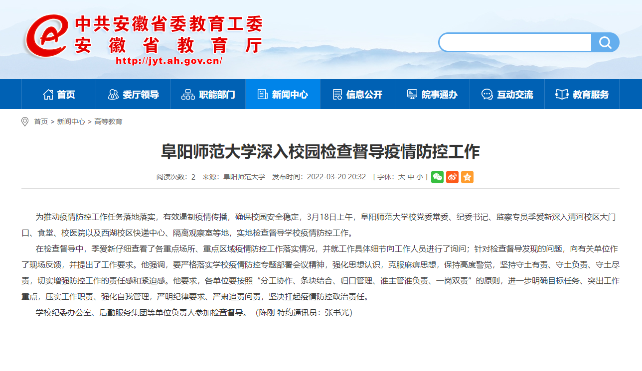 3月20日,安徽教育网报道:阜阳师范大学深入校园检查督导疫情防控工作。文章地址: