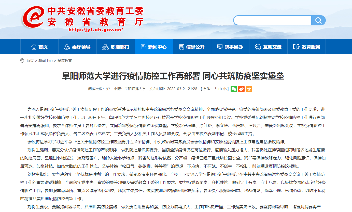 3月21日,安徽教育网报道:阜阳师范大学进行疫情防控工作再部署 同心共筑防疫坚实堡垒。文章地址: