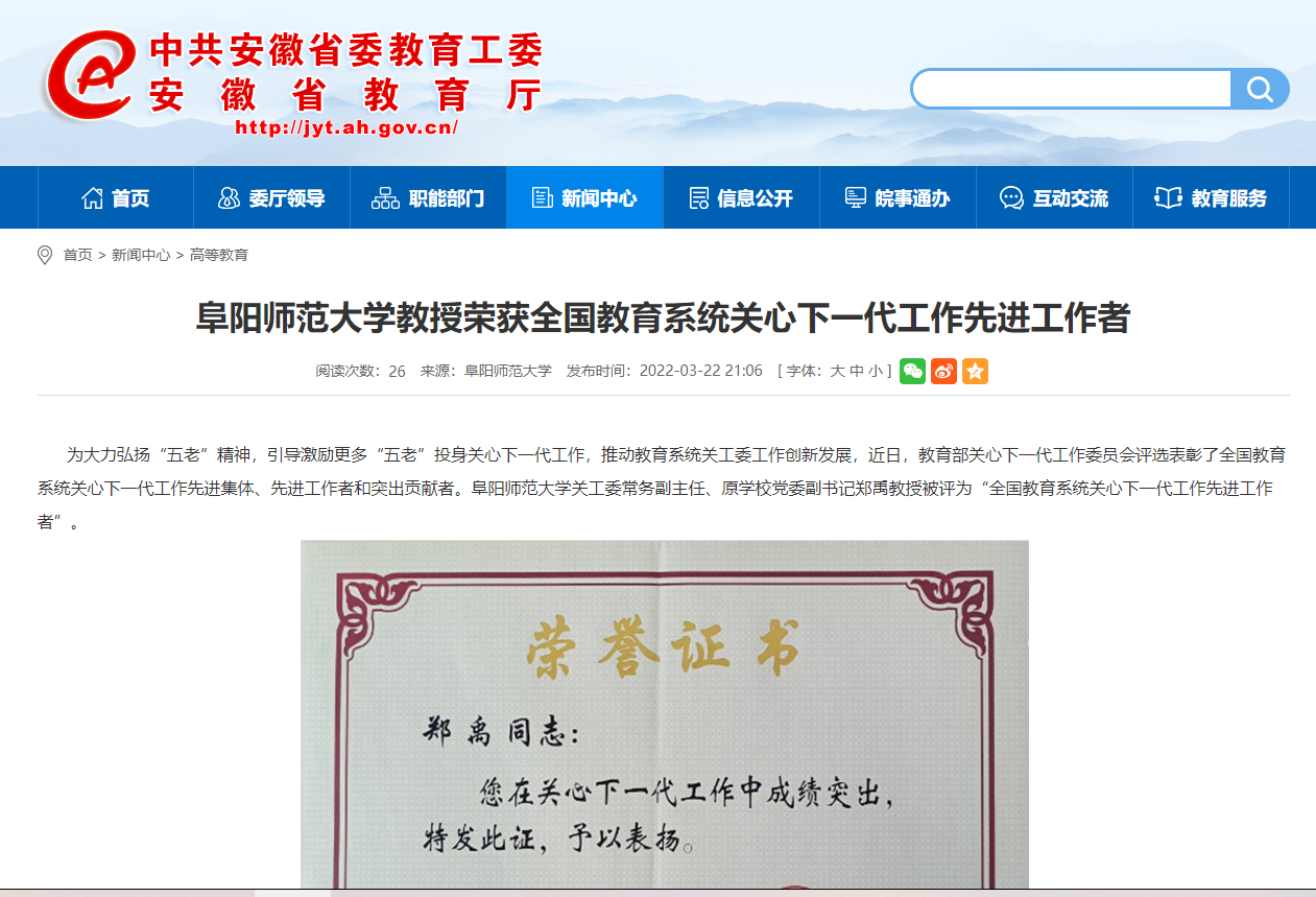 安徽教育网报道:阜阳师范大学教授荣获全国教育系统关心下一代工作先进工作者