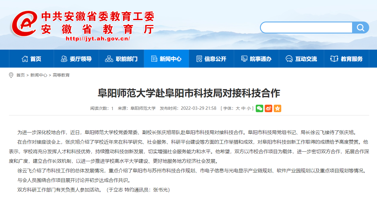 3月29日,安徽教育网报道:阜阳师范大学赴阜阳市科技局对接科技合作。文章地址: