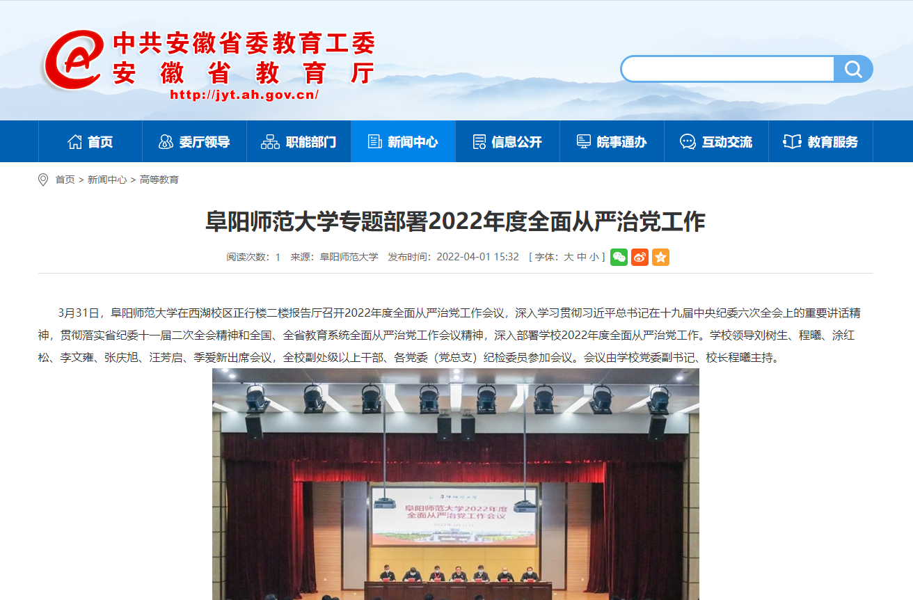 4月1日,安徽教育网报道:阜阳师范大学专题部署2022年度全面从严治党工作。文章地址: