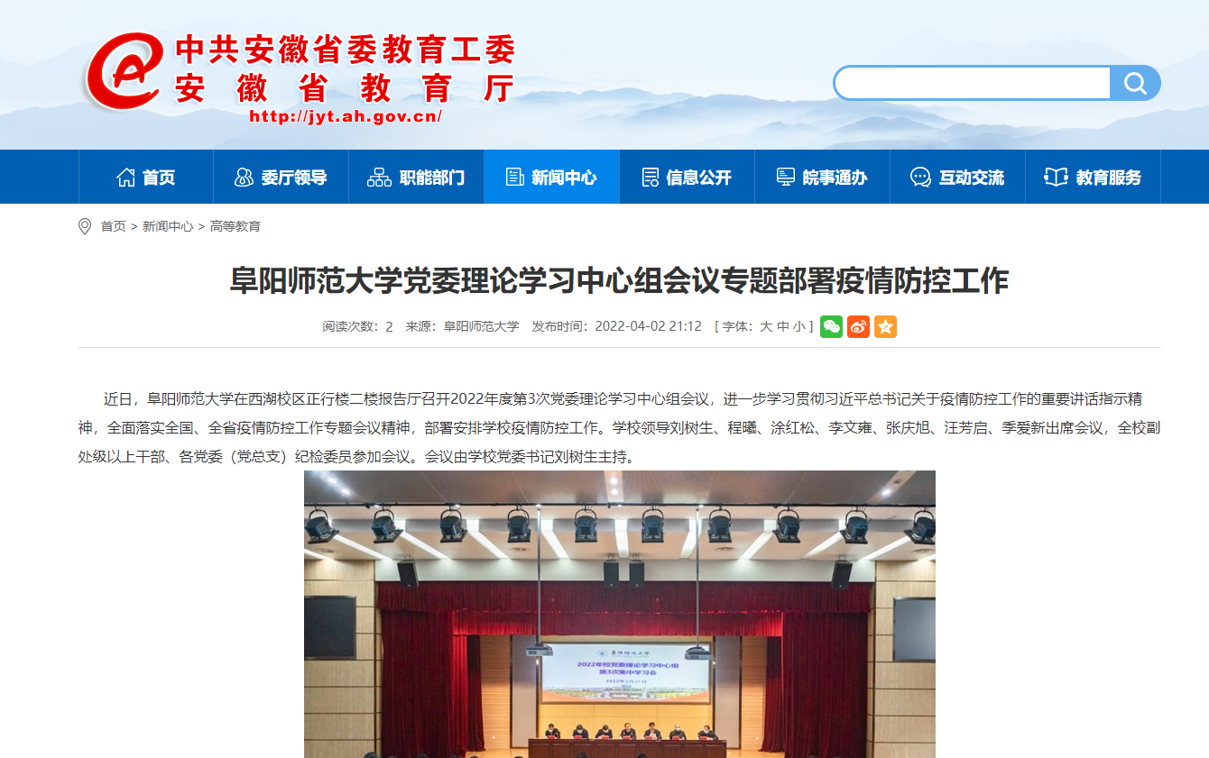 4月2日,安徽教育网报道:阜阳师范大学党委理论学习中心组会议专题部署疫情防控工作。文章地址: