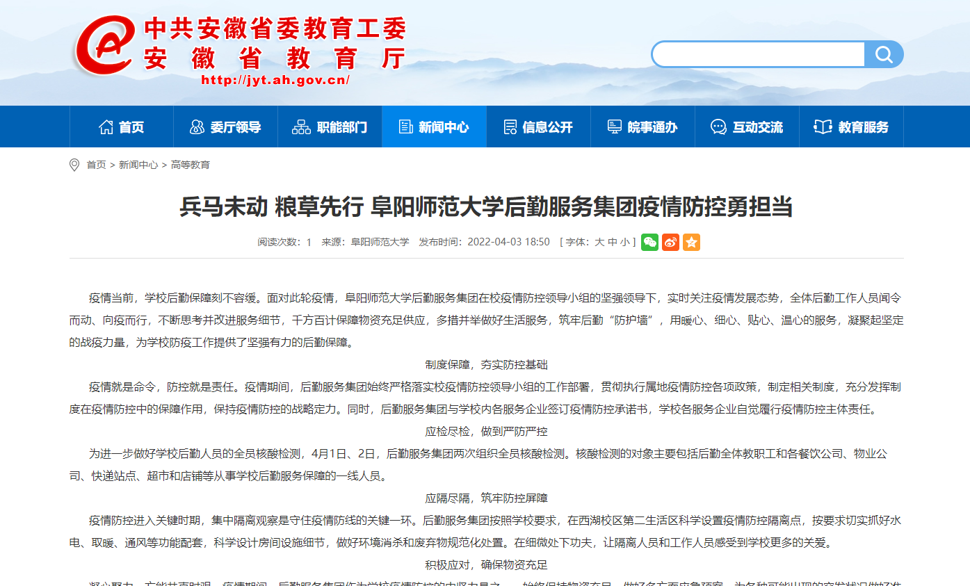 4月3日,安徽教育网报道:兵马未动 粮草先行 阜阳师范大学后勤服务集团疫情防控勇担当。文章地址: