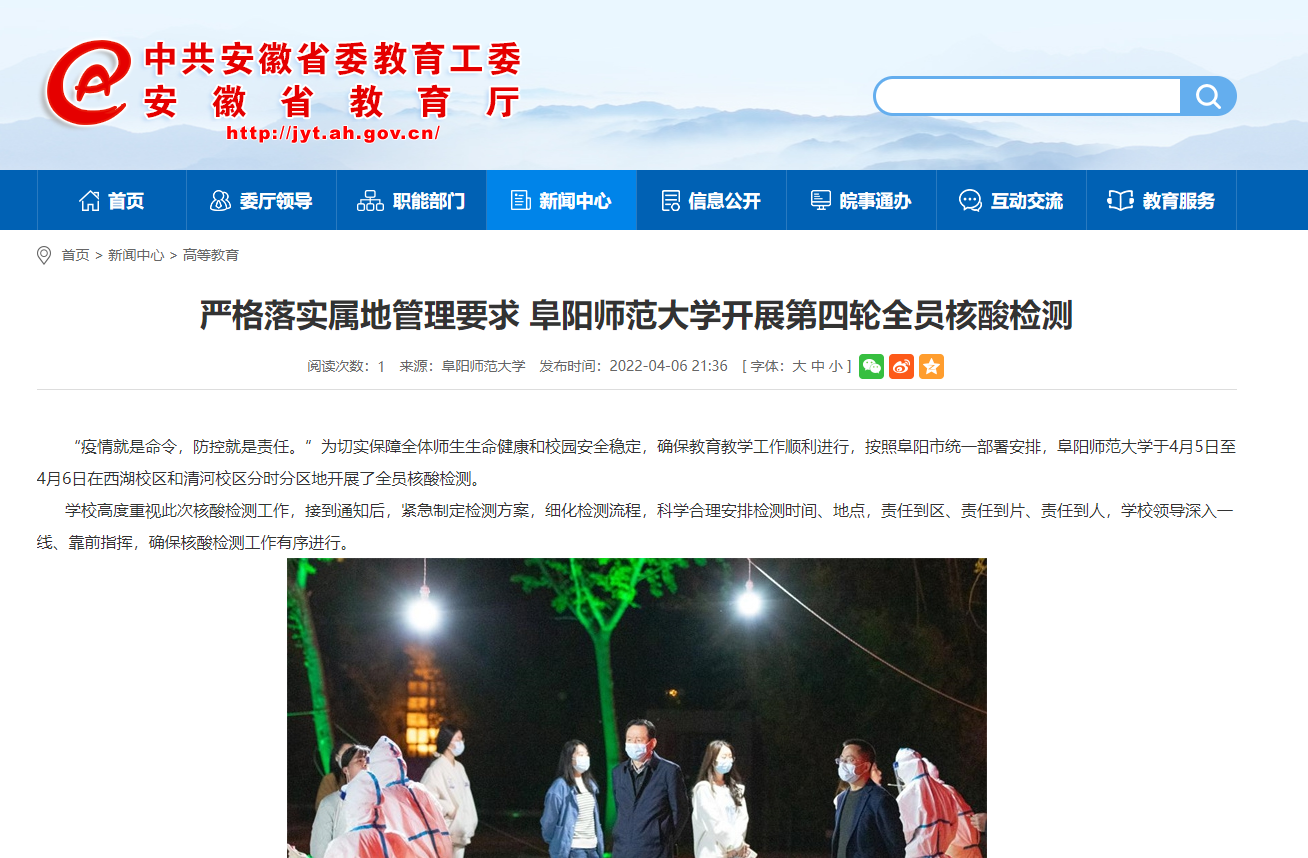 4月6日,安徽教育网报道:严格落实属地管理要求 阜阳师范大学开展第四轮全员核酸检测。文章地址: