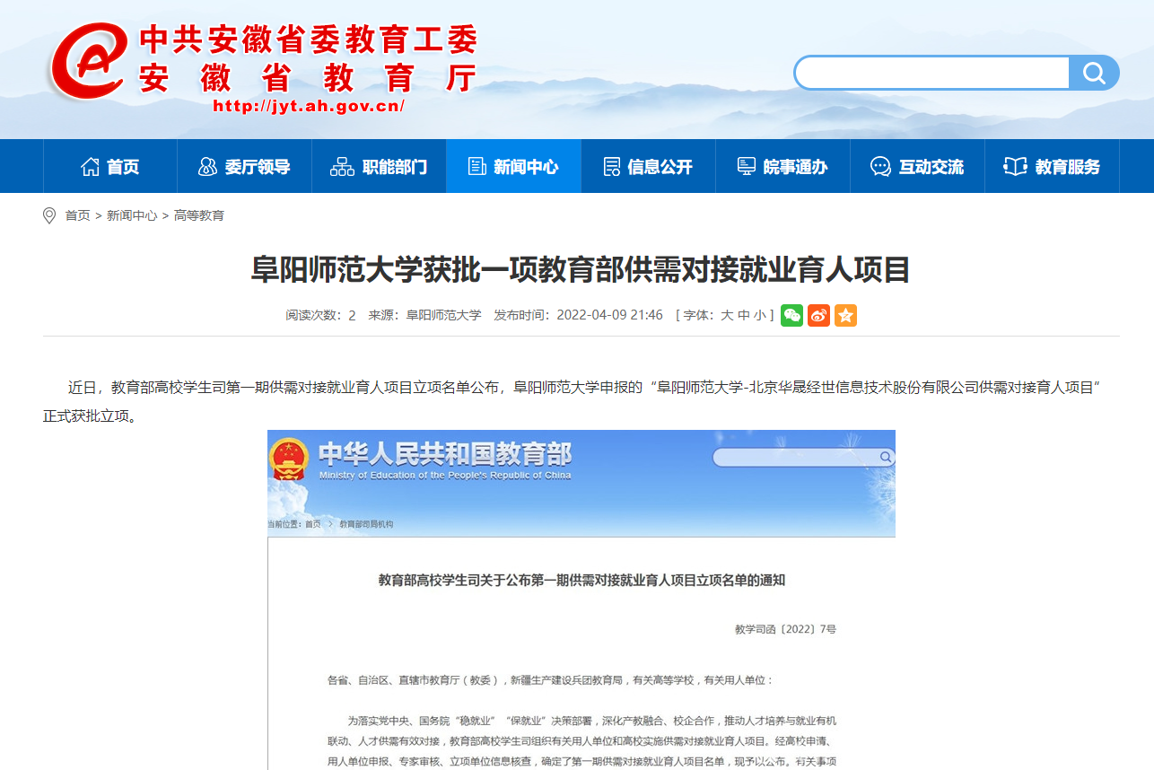 4月9日,安徽教育网报道:阜阳师范大学获批一项教育部供需对接就业育人项目。文章地址: