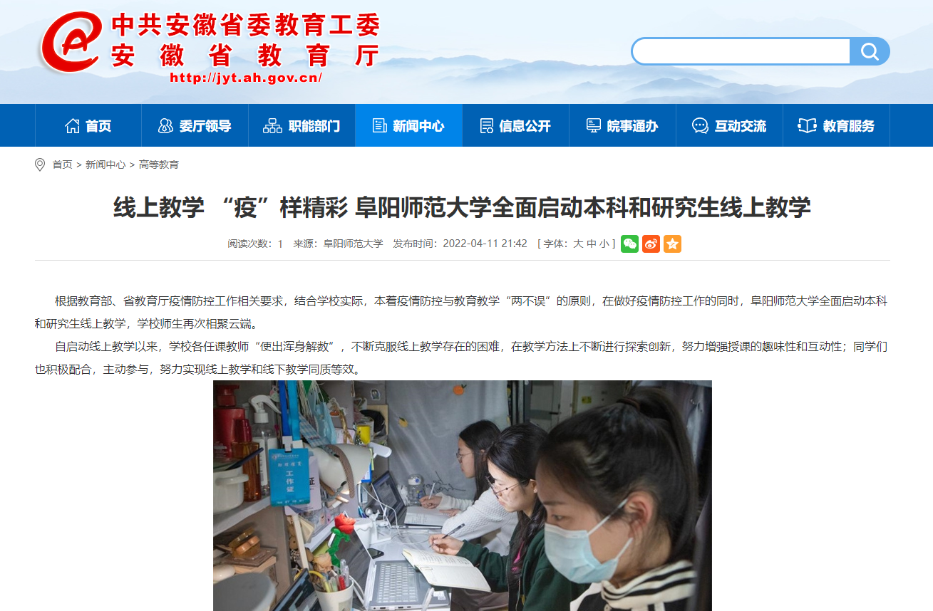 4月11日,安徽教育网报道:线上教学 “疫”样精彩 阜阳师范大学全面启动本科和研究生线上教学。文章地址: