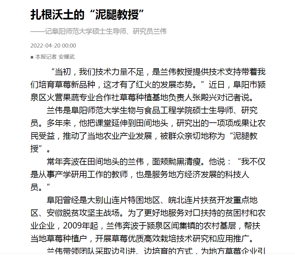 4月20日,安徽日报报道:扎根沃土的“泥腿教授”——记阜阳师范大学硕士生导师、研究员兰伟。文章地址:https://app.ahnews.com.cn/displayTemplate/news/newsDetail/899929.html?isDigital=true&isShare=true