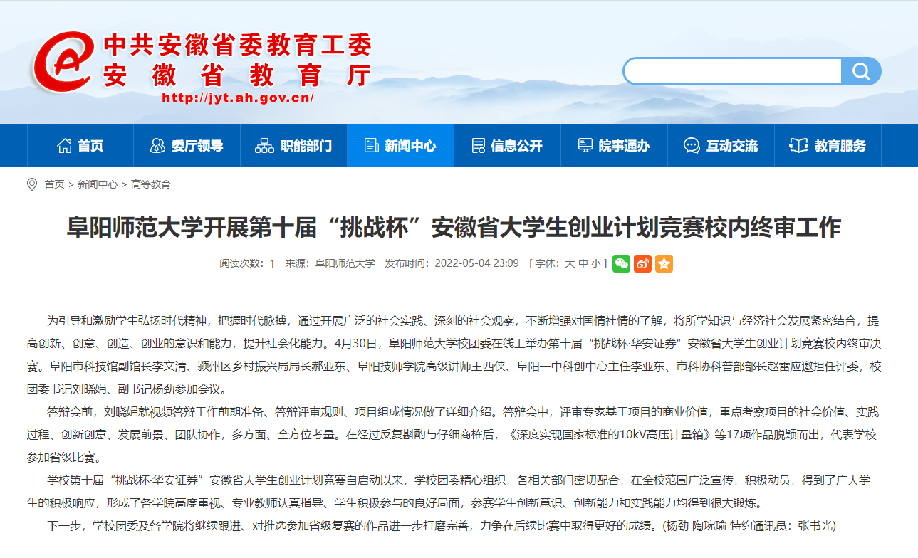 5月4日,安徽教育网报道:阜阳师范大学开展第十届“挑战杯”安徽省大学生创业计划竞赛校内终审工作。文章地址: