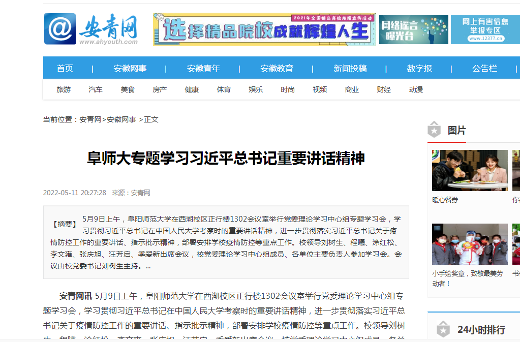 5月11日,安青网报道:阜师大专题学习习近平总书记重要讲话精神。文章地址: