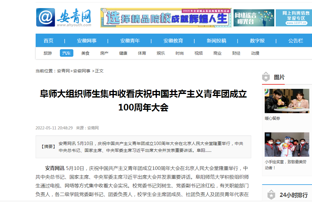5月11日,安青网报道:阜师大组织师生集中收看庆祝中国共产主义青年团成立100周年大会。文章地址: