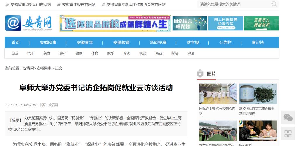 5月16日,安青网报道:阜师大举办党委书记访企拓岗促就业云访谈活动。文章地址: