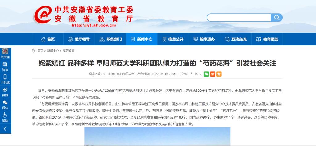 5月16日,安徽教育网报道:姹紫嫣红 品种多样 阜阳师范大学科研团队倾力打造的“芍药花海”引发社会关注。文章地址:http://jyt.ah.gov.cn/xwzx/gdjy/40560087.html