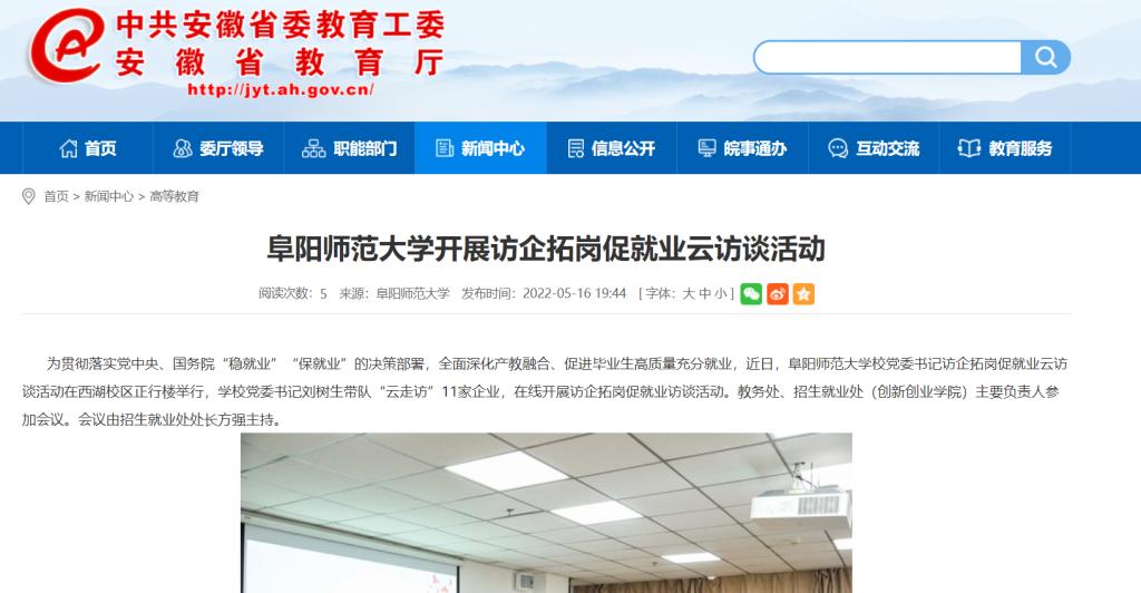 5月16日,安徽教育网报道:阜阳师范大学开展访企拓岗促就业云访谈活动。文章地址: