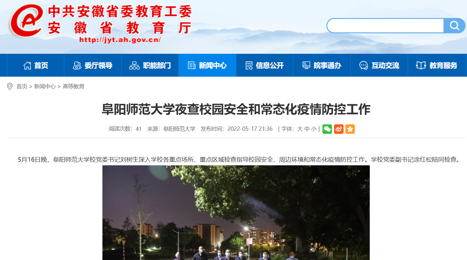 5月17日,安徽教育网报道:阜阳师范大学夜查校园安全和常态化疫情防控工作。文章地址: