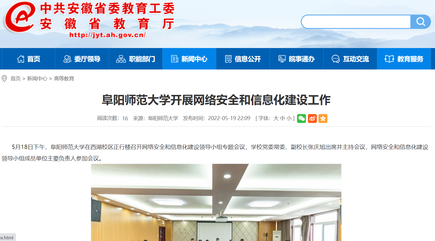 5月19日,安徽教育网报道:阜阳师范大学开展网络安全和信息化建设工作。文章地址: