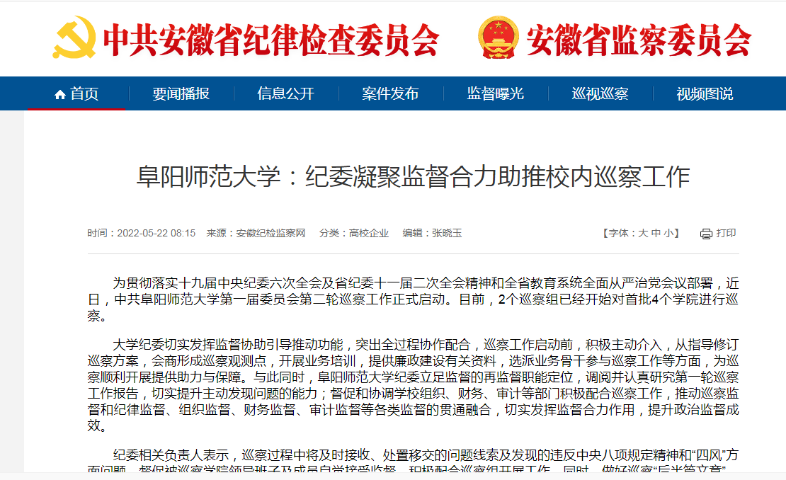 5月22日,安徽纪检监察网报道:阜阳师范大学:纪委凝聚监督合力助推校内巡察工作。文章地址: