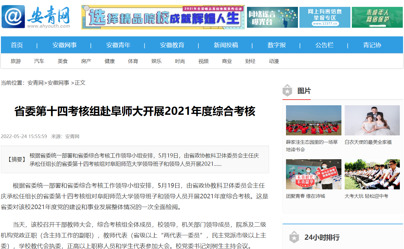 5月24日,安青网报道:省委第十四考核组赴阜师大开展2021年度综合考核。文章地址: