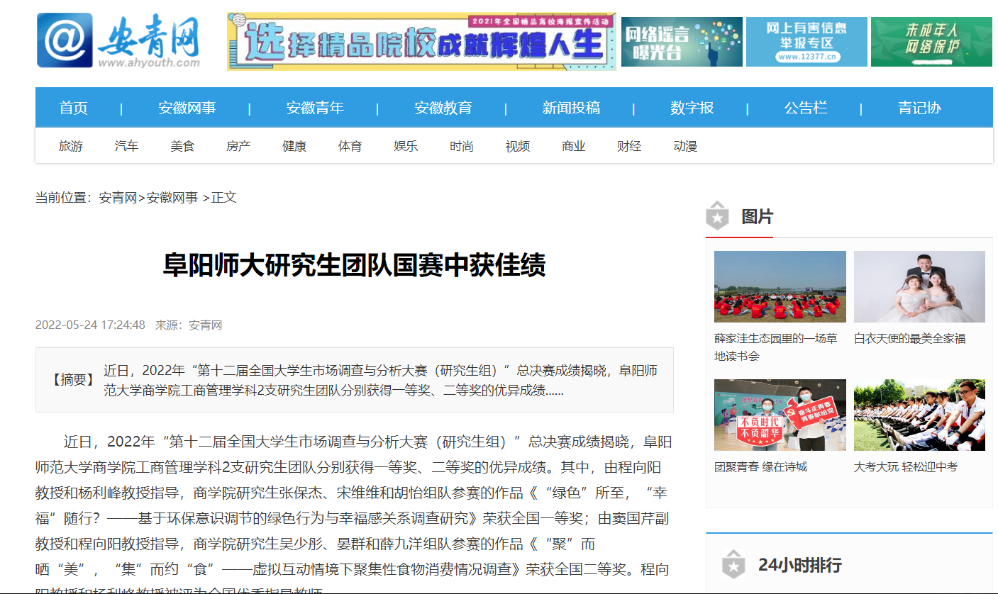 5月24日,安青网报道:阜阳师大研究生团队国赛中获佳绩。文章地址: