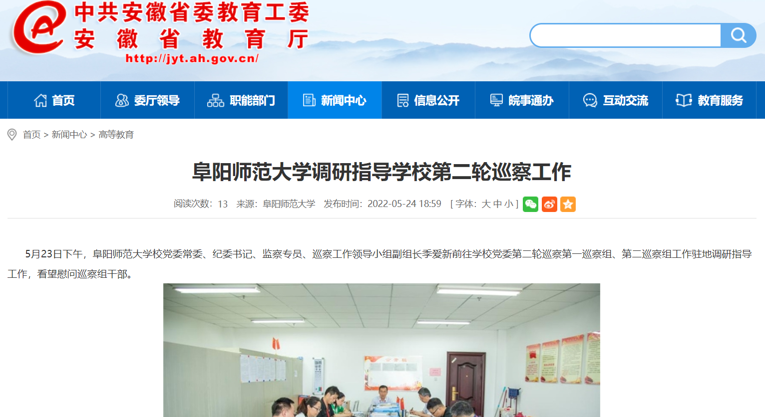 5月24日,安徽教育网报道:阜阳师范大学调研指导学校第二轮巡察工作。文章地址:
