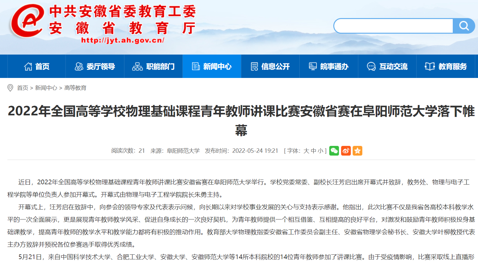5月24日,安徽教育网报道:2022年全国高等学校物理基础课程青年教师讲课比赛安徽省赛在阜阳师范大学落下帷幕。文章地址:http://jyt.ah.gov.cn/xwzx/gdjy/40562836.html