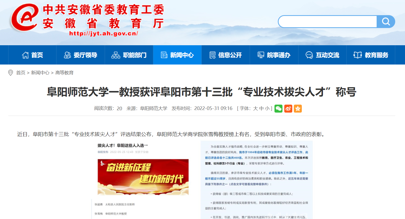 5月30日,安徽教育网报道:阜阳师范大学一教授获评阜阳市第十三批“专业技术拔尖人才”称号。文章地址: