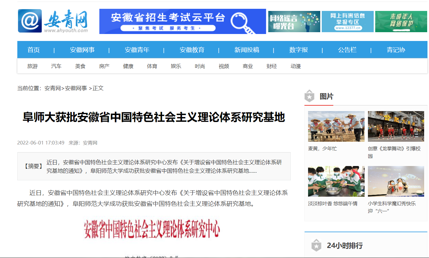 6月1日,安青网报道:阜师大获批安徽省中国特色社会主义理论体系研究基地。文章地址: