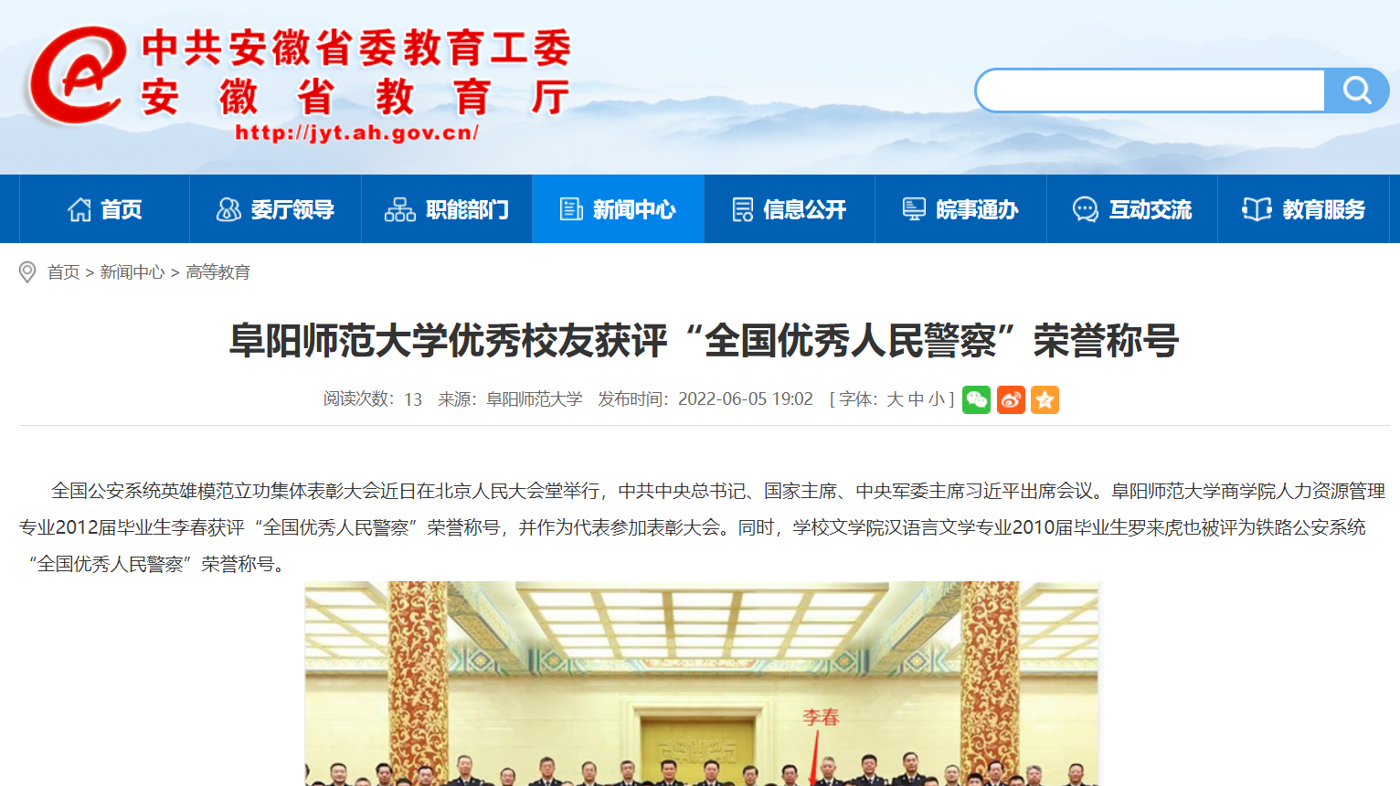 安徽教育网报道:阜阳师范大学优秀校友获评“全国优秀人民警察”荣誉称号