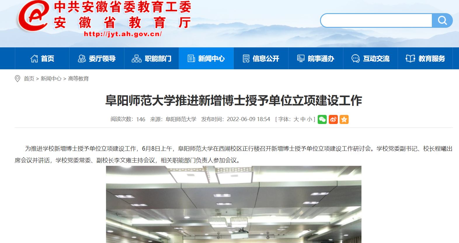 6月9日,安徽教育网报道:阜阳师范大学推进新增博士授予单位立项建设工作。文章地址:
