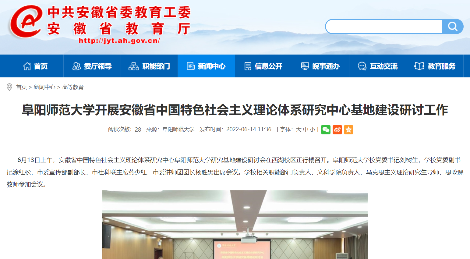 6月14日,安徽教育网报道:阜阳师范大学开展安徽省中国特色社会主义理论体系研究中心基地建设研讨工作。文章地址:
