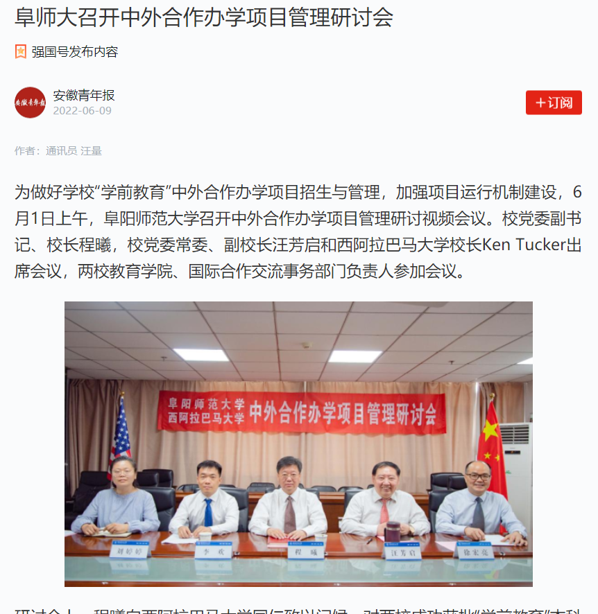6月9日,“学习强国”安徽青年报报道:阜师大召开中外合作办学项目管理研讨会。文章地址:https://article.xuexi.cn/articles/index.html?art_id=8815326430692336521&item_id=8815326430692336521&study_style_id=feeds_opaque&pid=&ptype=-1&source=share&share_to=wx_single