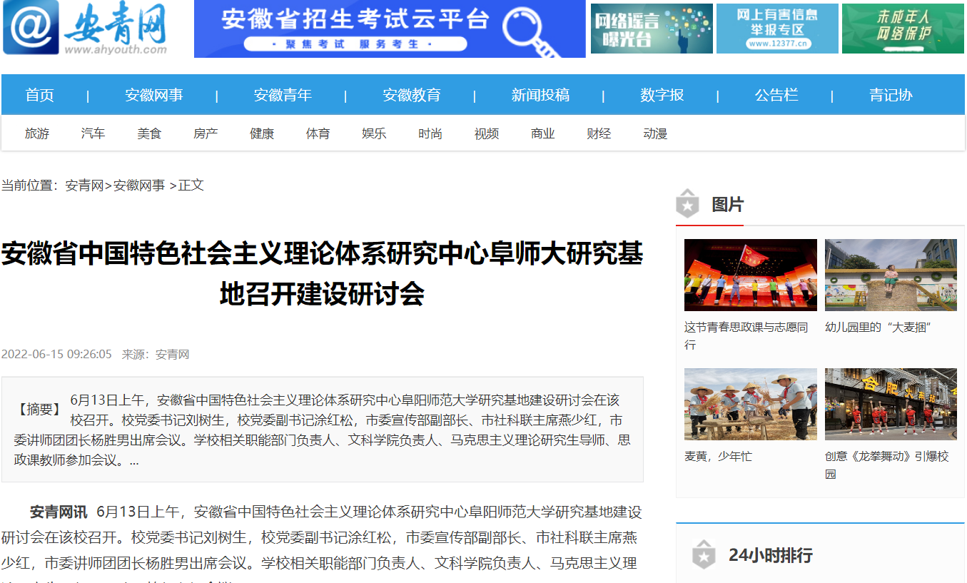 6月15日,安青网报道:安徽省中国特色社会主义理论体系研究中心阜师大研究基地召开建设研讨会。文章地址:http://www.ahyouth.com/news/20220615/1608456.shtml