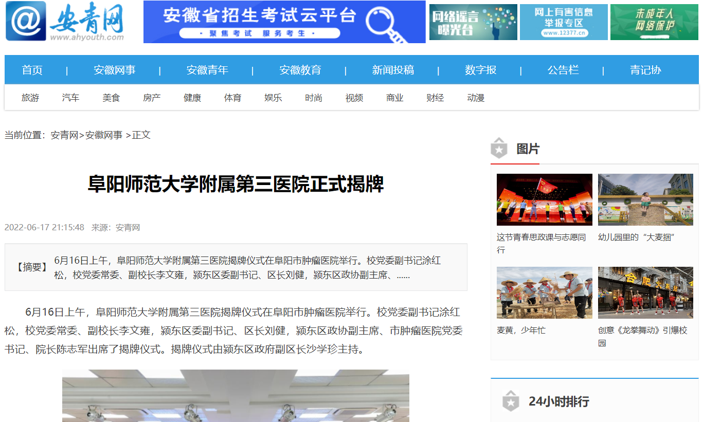 6月17日,安青网报道:阜阳师范大学附属第三医院正式揭牌。文章地址: