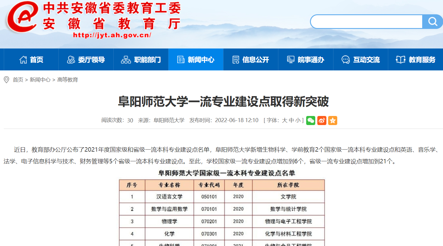 安徽教育网报道:阜阳师范大学一流专业建设点取得新突破