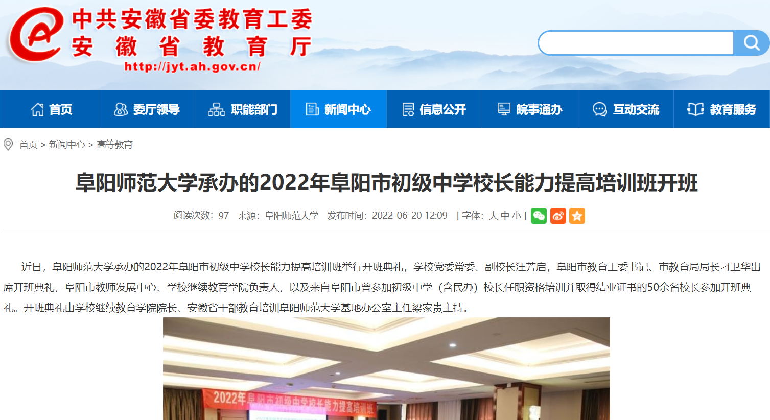 6月20日,安徽教育网报道:阜阳师范大学承办的2022年阜阳市初级中学校长能力提高培训班开班。文章地址: