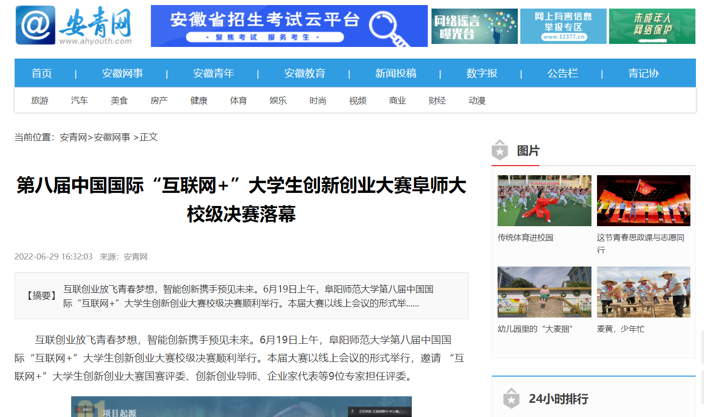 6月29日,安青网报道:第八届中国国际“互联网+”大学生创新创业大赛阜师大校级决赛落幕。文章地址: